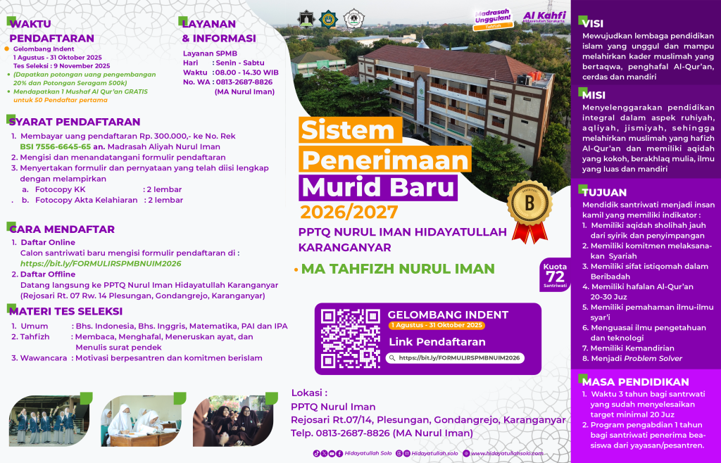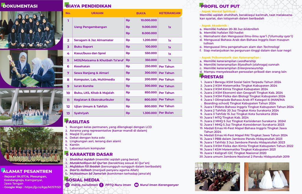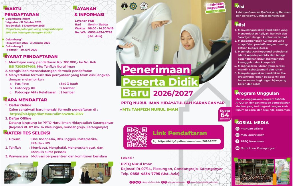 Pesantren Tahfidz Putri Nurul Iman adalah lembaga pendidikan Islam yang berfokus pada penghafalan Al-Qur'an 30 juz dengan sanad, serta pengembangan karakter muslimah yang sholihah dan mandiri
